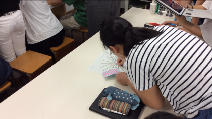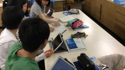 次に、感染源と線でつながれた点にシールを貼り、いくつの点に感染したかを記録します。その様子をiPadで写真撮影し、後から振り返りやすくします。この作業を全部の点がコンピュータウイルスに感染するまで繰り返します。