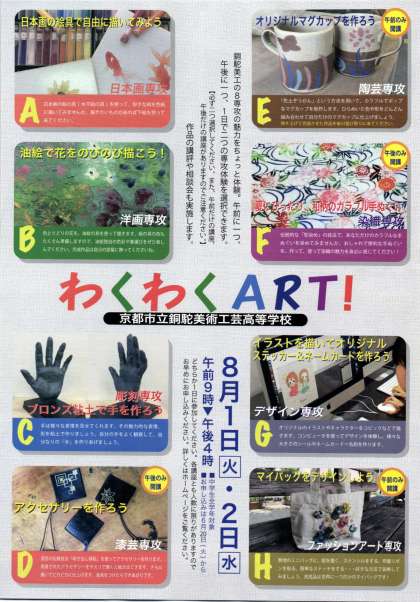 「わくわくART!」は本校の魅力ある8専攻に関わる体験実習を2つ選んで楽しんでいただけます。もちろん本校生徒による学校紹介、入試等に関する相談会、持参作品講評会も行います。