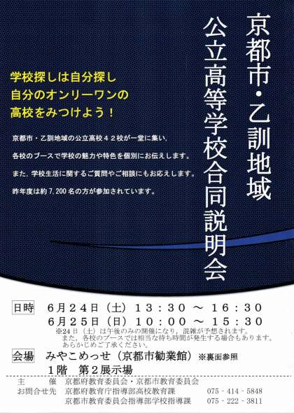 6月24日(土)午後と25日(日)、京都市岡崎の「みやこめっせ」で「公立高校合同説明会」が開催されます。