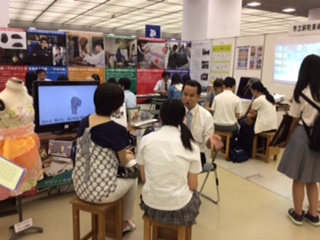 展示物や、学校紹介VTR、生徒作品もご覧いただきました。教員は、iPadを使いながら、さらに詳しく本校の教育活動や、学校の授業の様子、生徒の活動の様子などご紹介いたしました。