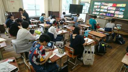 これは効果音や民族音楽を材料に様々な音を再生しながら形や色を発想して制作する課題です。1回目の授業では、用意されたいくつかの音楽の形のクロッキー、色のクロッキーをしました。2回目の授業では、各自が選んだ音楽をタブレット「iPad]に入れてきて、その音楽をもとに制作しました。