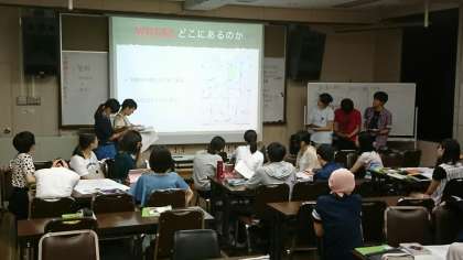 各グループが「町家」「町並み」「京菓子」「茶道具」「枯山水」「襖絵と建築空間」の6テーマに分かれ調査・研究しています。今日は、各グループの現時点での研究状況を報告し、それぞれの小テーマにおける「美」とは何か、という仮説を立てていることろです。
