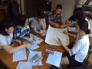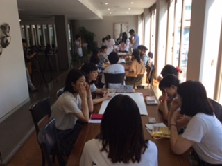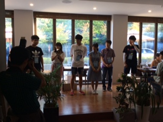 長沙市の派遣団は、飛行機の到着が遅い時間になるので、ホテル到着後、先に日本と韓国の生徒がグループごとに自己紹介をしました。言葉の壁を乗り越えるために、双方の生徒はいろいろ工夫をしていました。