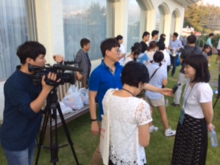 早く仲良くなるために、ゲームも行われました。地元のローカルテレビが、この交流事業をつきっきりで取材しています。本校生徒もしばしばインタビューを受けます。