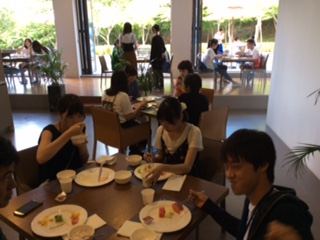 ホテルでの朝食は、テラスから爽やかな風が入るレストランで