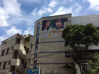 近代通りの散策ツアーでは、生徒がビルの上にある韓国ドラマのスターの看板を発見。