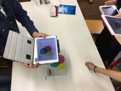 その後、台紙の上に「色の三原色」を印刷した透明フィルムを重ねて、どのような色になるか確かめ、iPadで撮影をしました。