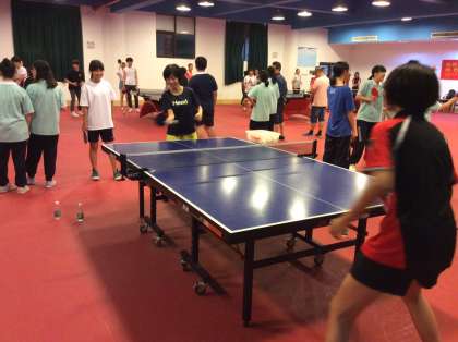 交流会最後に卓球チームによる日韓生徒への卓球レクチャーを受けたあと、日中韓の友好親善試合を行いました。