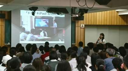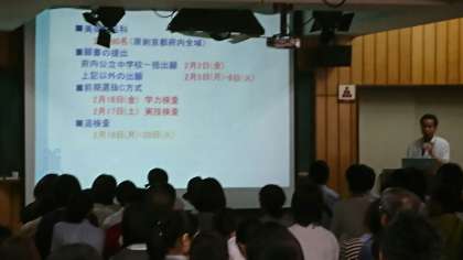 校長挨拶の後、学校指導課の桝本徳裕指導主事よりご挨拶いただきました。続いて、教頭より平成30年度入学者選抜について、企画推進主任よりタブレット(iPad)を活用した教育活動について説明いたしました。