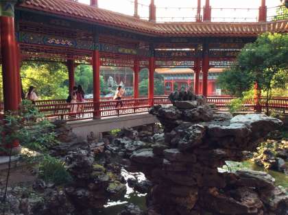 門をくぐると、大きなモニターが目に入り、東アジア文化都市の3日間の取組内容が映像で紹介をされていました。建物の中に入ると、そこには大小いくつもの中国式庭園があり、色彩豊かな建築物が目に留まりました。よく中国のドラマや映画で使用されるそうです。