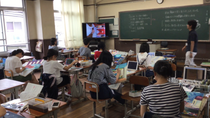 そこでこの課題を解決するため、お互いの制作進捗状況を知る方法として、iPadを活用した生中継を行い、教室のモニタで鑑賞を行いました。