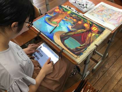 教員のiPadを相互に接続し、一方のiPadでは作品を映して解説、もう一方はその映像と解説の声を受けます。