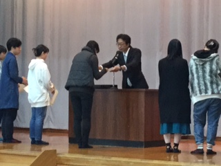 本日昼休み、後期生徒会役員立会演説会に先立って、「第38回美工作品展」学校賞の受賞者14名、および京都市幼児児童生徒作品展に選ばれた生徒20名の表彰式を行いました。
