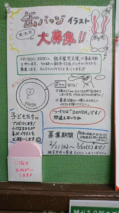写真上 缶バッジイラストが募集の呼びかけ掲示