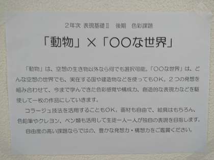 2年生「表現基礎2」で取り組んだ課題「動物×〇〇な世界」の展示