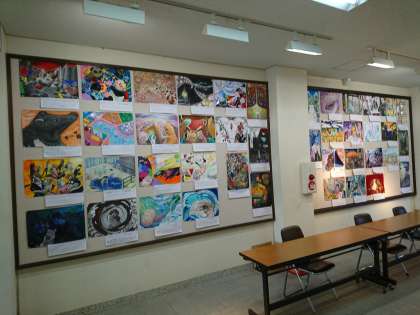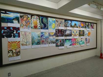 2年生の専門科目「表現基礎2」で取り組んだ課題「動物×〇〇な世界」の作品を本校記念棟のマルチホール前に展示しています。