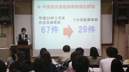 本校生徒は市内、府下、近隣府県から通学していますが、毎年、自転車通学を申請する生徒は、交通安全教室を受講してから許可をします。