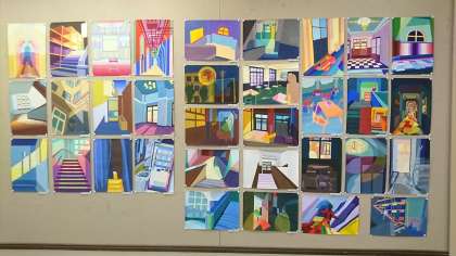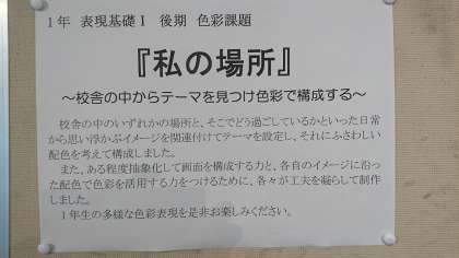 現在、昨年度1年生の「表現基礎1」の後期色彩課題「私の場所〜校舎の中からテーマを見つけ色彩で構成する」の作品を展示しており、新入生が鑑賞しています。
