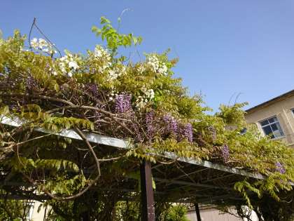 藤棚の藤の花が、白色、紫色の花房をつけ、晩春の気配。
