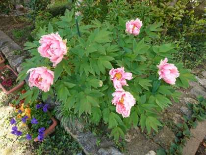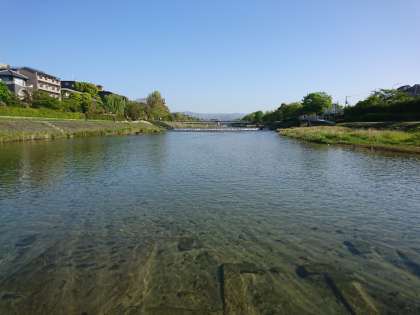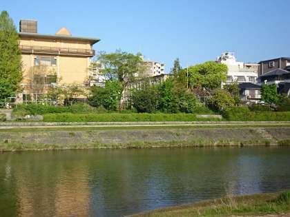 鴨川からの風景もますます美しい季節。校庭にはボタンが咲いています。