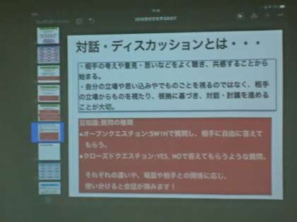 iPadを効果的に活用しながら、ワークシートにしっかり書き込みもして、授業を進めていきます。ディスカッションの際には、質問役、答える役、やり取りを観察する役を決めて進めました。そうしたことで、良かった点や、もっとこのように工夫をした方が良い点など、たくさんの気づきができました。