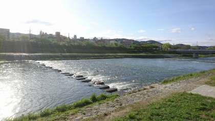 先日の雨で水量が増えた鴨川。学校の東側にある鴨川の飛び石も、今日は渡れませんでした。