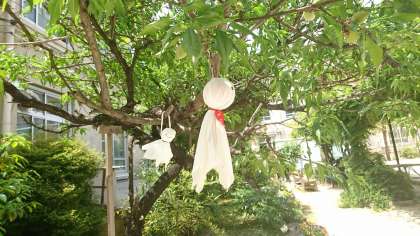 今朝方から、金曜日は「曇り」の予報に変わり、降水確率が下がってきています。グラウンドの樹につるした校長作の「照る照る坊主」の威力でしょうか。そんな話を生徒としていたら、いつのまにか生徒作の「照る照る坊主」が登場し、力強い応援が加わりました。