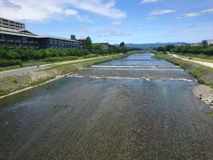 20日は、素晴らしいお天気で、青葉若葉が美しく輝いています。二条大橋から見る鴨川の姿も爽やか。