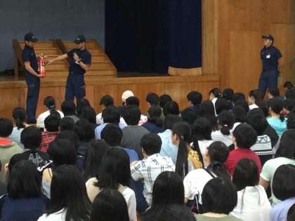本日は雨天のため体育館へ集合することに変更しましたが、中京消防署の方から講評、講話、消火器の使い方についてお話していただきました。