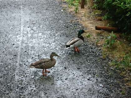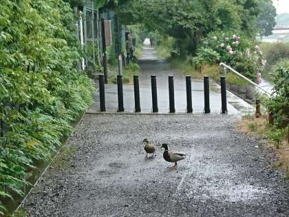 学校すぐ東側の遊歩道には鴨が上がってきていました。「よく降るね」「そうだね」と会話しているような。横を通っても、気にせず川のほうを見ていました。