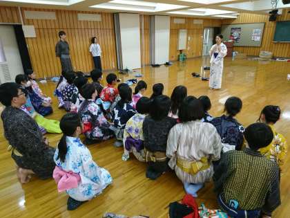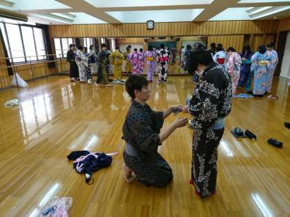 授業は2回に分けて、浴衣の歴史を学んだあと、帯の締め方、浴衣の着方を実際に体験します。今日は2回目。実際に浴衣を着て帯を締めるところまでやりました。着付けが終わった後、浴衣の歴史について講師の先生からお話を聴きました。最後は、しっかりたたみ方も学びました。