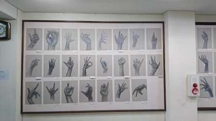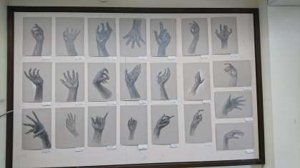 現在、記念棟2Fのオープンギャラリーで全生徒の作品を展示しています。それぞれが考えた手のポーズをしっかり観察して仕上げました。