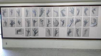 2年専門科目「表現基礎2」 課題「手のデッサン」の作品をオープンギャラリーで展示しています。
