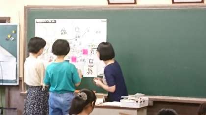 教科書の本文には、人物や地名がたくさん登場しますが、物語の舞台となった場所、状況をイメージをもって理解するために、黒板に地図を掲示し、登場人物のプレートを用意しました。