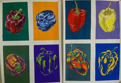 先日より、生の「表現基礎1」で、パプリカをモチーフに取り組んだ「色彩の表現〜色の三属性をテーマに表現する」という課題の作品を、記念棟オープンギャラリーに展示しています。