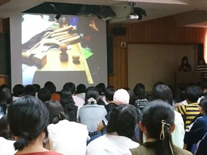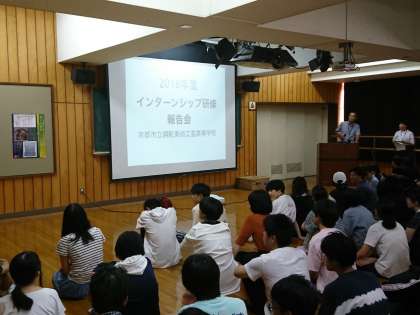 毎年1・2年生を対象に紹介し、申し込みをした生徒に事前指導を行ったうえで夏季休暇中に研修を行いました。事後指導のあと、各生徒は報告会のためにまとめを作成し、本日4限、1・2年生全員がマルチホールに入り、報告会を開催しました。