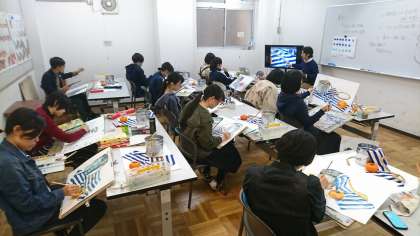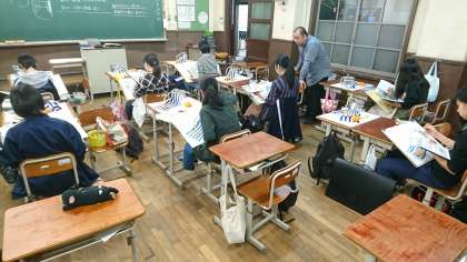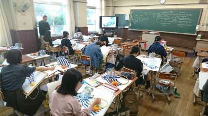 2年生の「表現基礎2」では、色彩表現に取り組んでいます。モチーフは、柿、縄、缶、手ぬぐい、です。