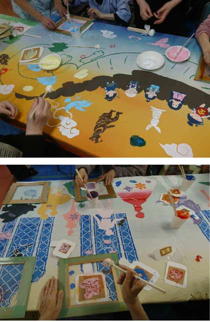 という2つのテーマを設定して、染めとステンシルで下地をあらかじめ準備した作品に、手作りの型紙と着色道具を使用して装飾していただくという内容で行いました。約30名の入所者の方々が順番に参加してくださり、交流会は大盛況でした。