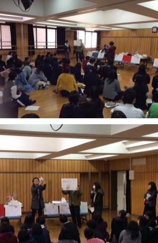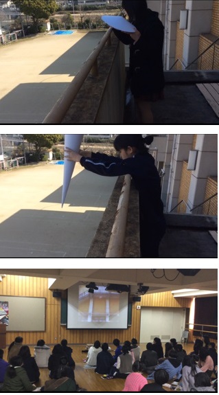 今回は、落下実験本番の日。2年生全員マルチホールに集まり、記念棟3Fから各グループで制作した立体を落下させる模様をタブレットとアプリケーションZoomを使って生中継しました。すべてのグループの立体落下のあと、各グループごとに制作と落下結果についてまとめの発表を行いました。