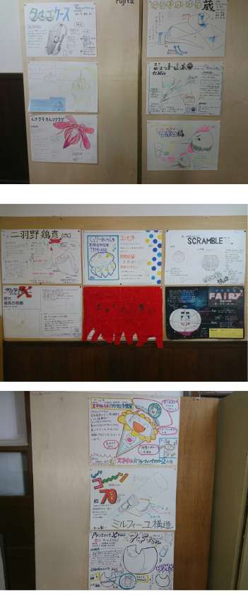 2年専門科目「表現基礎2」 立体制作 「プロジェクトX〜舞い降りた麗しき黄身」 グループごとのプレゼンボード