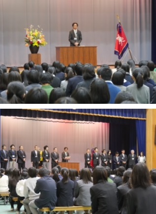 始業式は、校長の挨拶、学級担任、補助担任紹介、各部主任の紹介を行いました。始業式のあと新入生と2・3年生徒の対面式を行いました。生徒会執行部長の歓迎の言葉、新入生代表の挨拶を行いました。