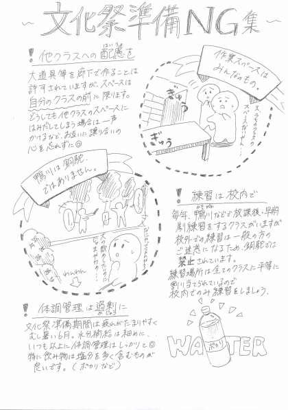 4月末の新旧生徒会役員引継会で、生徒の中から「文化祭をよりよい行事にするために、ルール、マナーの啓発をしたい」と発案があり、啓発活動(啓発プリントの制作、全校配布、クラス掲示)をすすめています。この啓発活動の中心メンバーは、生徒会執行部、旧執行部、文化委員長・HR委員長・評議委員長の9名です。