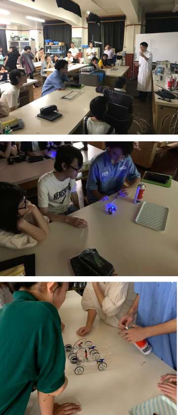 そのあとは実際に燃料電池車の小さな模型を水素燃料で動かしてみるワークショップです。動作実験をグループに分かれてスピードや燃費を競わせる形でおこないました。これには訳があって、エンジンの燃料電池セルを2個または4個を直列に繋いで差によってスピードや燃費に違いがあることをのちに種明かしとして学ぶことが出来ました。
