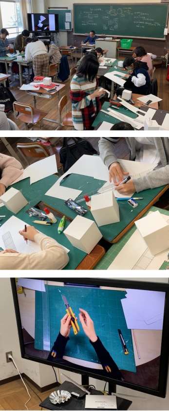適切なカッターナイフの使い方については、本校教員が映像で制作し、事前に生徒一人一人のタブレットiPadに配信しています。カッターナイフの使い方を説明するために学校の授業時間を使わず、家庭で予習してくるように指導しているので、授業ではすぐに内容に入って制作を進められます。もう一度確認したい生徒は、各自のタブレットに取り込んだ映像データをもう一度見ることが可能で、効果的に授業を進めることができます。