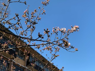 学校の鴨川寄りの桜も開花しました。今年は暖冬と言われ,連年よりも早く桜が開花したので,4月8日の入学式の頃は,満開を過ぎて散り始めているかもしれません。