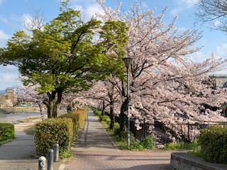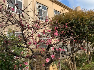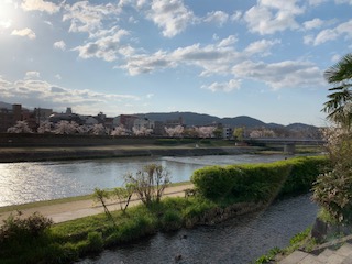 鴨川河畔の桜は満開。今週になって学校の桃の花もひらきました。