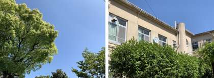 本館,記念棟,実習棟が美しい緑の中で輝いています。