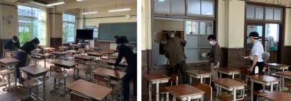 本日,教職員が協力して,ホームルーム等の清掃,消毒を行いました。