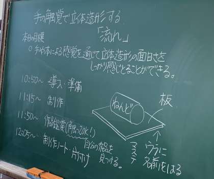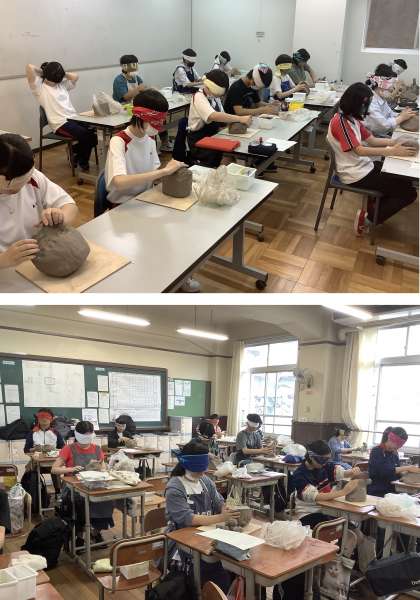 テーマは「流れ」。目隠しをしてから粘土で「流れ」をそれぞれ表現します。一定時間制作をしたら,生徒が目隠しをしている間に,教員が作品の置場所を変えます。その後,生徒は目隠しを外し,その講座のみんなの作品鑑賞を各自で鑑賞します。そうして,目隠しをして造形した自分の作品を探します。果たして,視覚に頼らず,手の感覚だけで制作した作品を視覚で見つけることができるのか。