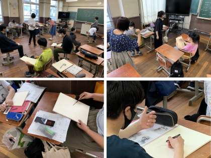 生徒は,前回までの授業で,全員8分野の実習を終了し,今日は3分野を選択するためのガイダンスと質問ができる時間。例年なら先輩の2年生・3年生の専攻ごとのプレゼンテーションを聞くのですが,新型コロナウィルス感染症対策として「密」を回避するため,クラス単位でローテーションを組み,専攻教員がガイダンスを行いました。ガイダンスと質問以外の時間は,人物クロッキーに取り組みました。